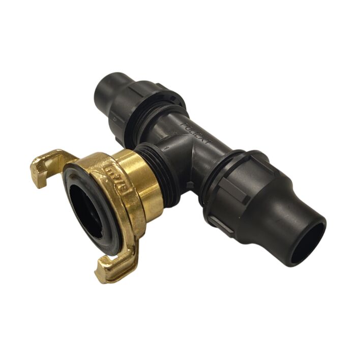 De druppelslang startkoppeling met Geka combineert een Geka-koppeling met een druppelslang T-stuk, zodat je eenvoudig je tuinslang met Geka-aansluiting kunt koppelen aan je druppelslangen.