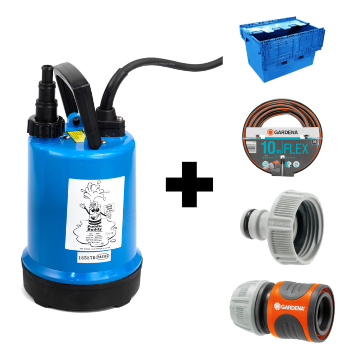 De Puddle Buddy set is een handige box die alles bevat om je Puddle Buddy aan te sluiten en direct te gebruiken. Deze set bevat een 10 meter lange Gardena flexibele waterslang met een diameter van 13 mm, die bestand is tegen een druk tot 25 bar en zowel vorst als zonlicht trotseert.