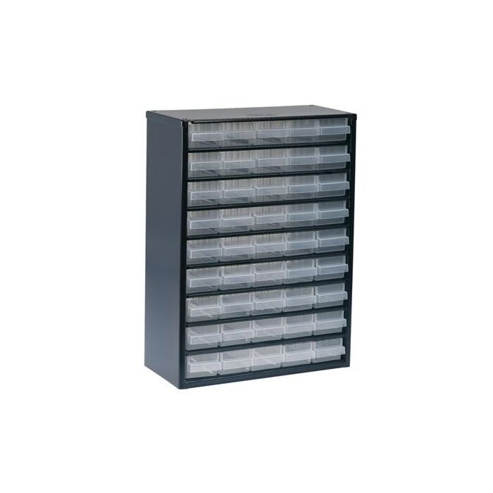 Kast met 45 laden, type 150-00. Elke lade kan in 4 vakken worden verdeeld. Kast van staal en laden van polypropyleen (PP).