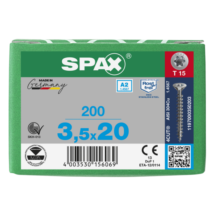 Spax spaanplaatschroeven T15 RVS A2 3.5 x 20 mm mm voldraad 200 stuks